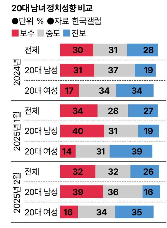먼저 이들의 정치성향부터 보자. 작년 연간으로 볼 때 20대(18~29세) 남성 중 자신의 주관적 정치성향을 보수라 답한 이들은 31%다. 진보(19%)를 크게 앞선 건 분명하다. 하지만 보수 응답은 전체 평균(30%)과 엇비슷한 수준이다. 20대 여성(17%)과 대비돼 도드라질 뿐이다.