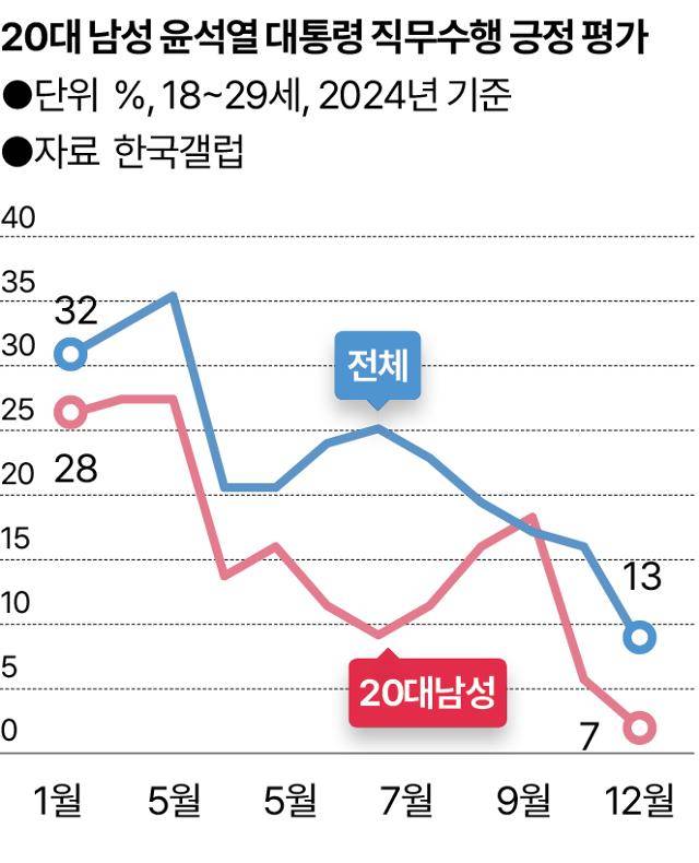 계엄 이전에는 달랐을까. 그들이 2022년 대선에서 표를 몰아줬던 윤 대통령의 국정운영을 지지했을까. 그렇지 않다. ③윤 대통령의 직무수행에 평균보다 훨씬 박한 평가를 해왔다. 작년 연간으로 볼 때 ‘직무수행을 잘하고 있다’는 응답은 20대 남성 19%, 30대 남성 18%였다. 2030 여성(20대 11%, 30대 14%)에 비해선 높지만, 전체 평균(26%)은 한참 밑돈다. 다른 세대들과 비교하면 윤 대통령 지지도가 많이 낮았다는 얘기다. 특히 계엄 직전인 11월에는 10%(전체 19%), 직후인 12월엔 7%(전체 13%)로 급전직하했다. 최병천 신성장경제연구소장은 이런 2030 남성을 “탄핵을 찬성하는 중도보수 성향의 스윙보터”로 규정했다.