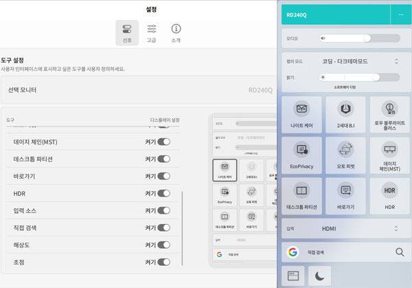 코딩 모드는 모니터 하단 제어박스 전면 중앙에 터치 버튼을 통해 바로 불러낼 수 있고, 우측면에는 장시간 모니터를 뚫어져라 바라보는 프로그래머의 눈 건강을 위한 아이캐어 기능 활성화 여부를 즉각 알아볼 수 있는 LED가, 우측에는 주변 광원 상황 모니터링을 위한 센서들이 담겨 있다.