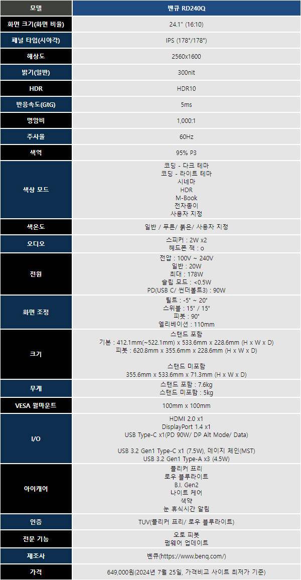 벤큐 RD240Q는 이런 점을 고려해 일반적인 16:9 비율이 아닌 16:10 비율의 24.1" 크기 화면을 채택했다. 해상도는 WQXGA 규격으로 구분되는 2560 x 1600 해상도이며, 덕분에 기본 가로 모드에서 세로로 더 긴 화면을 볼 수 있다.