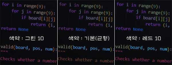 벤큐 RD240Q는 색약을 겪고 있는 프로그래머를 위해 빨간색과 녹색 농도를 조정하는 색약 모드도 제공한다. 위 사진은 코딩 다크 테마 기본값에서 색약 옵션을 조정한 것이다. 여기에 블루라이트 기술과 플리커 프리 기술은 TUV 라인란드 인증을 받았다.