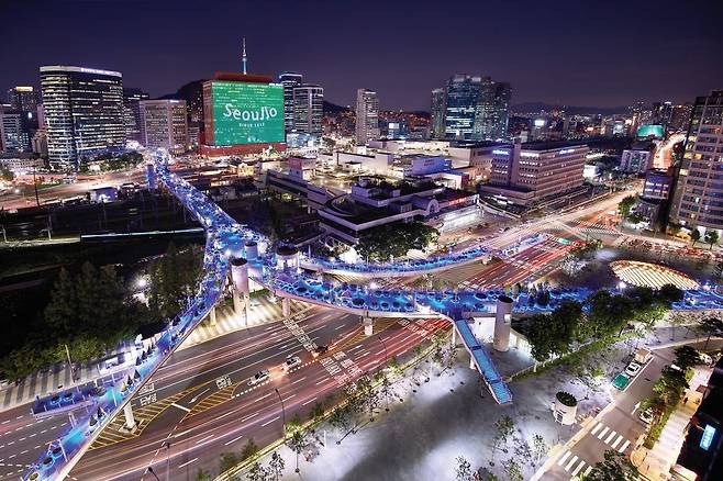 서울역 위 고가도로를 개조해 만든 보행자 전용길 서울로7017은 숨겨진 서울 풍경 보기 좋은 곳인데요. 특히 밤이 되면 조명과 함께 고층 빌딩, 기차역, 남산타워까지 어우러진 이색 풍경이 펼쳐지죠.