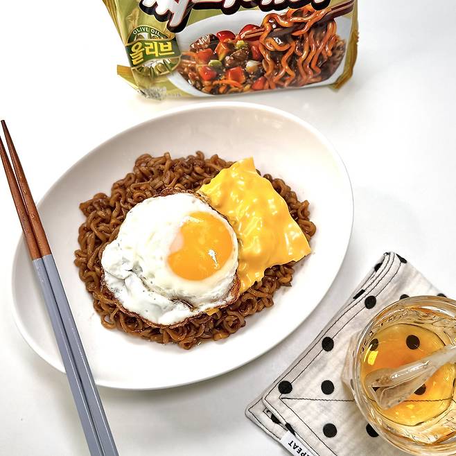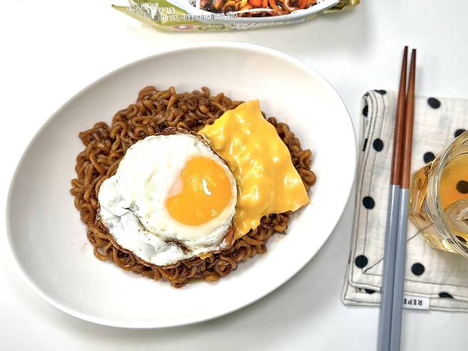 📝재료: 짜장라면 1개, 물 300ml, 참치액 1스푼, 설탕 1스푼, 체다치즈 1장, 반숙프라이 1장
