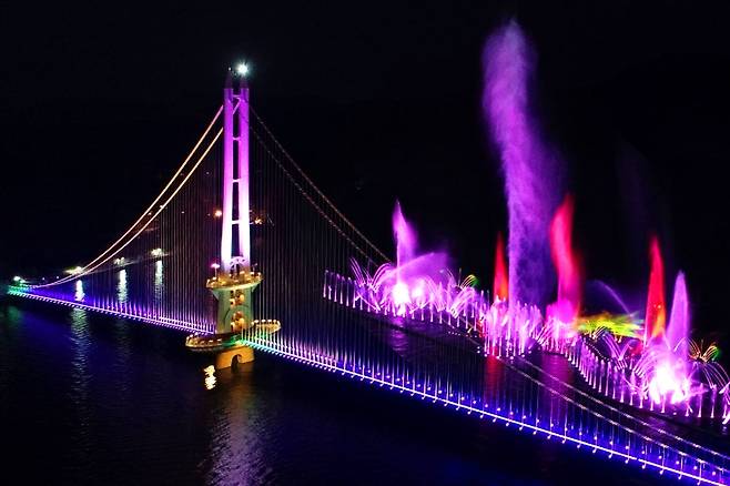 음악 분수의 면적은 1536㎡에 달해 호수에 설치된 가장 넓은 음악 분수로 공식 기록에 올랐습니다. 당호 출렁다리에 그라데이션 기법을 적용한 형형색색 LED 불빛을 이용한 공연이 20분간 진행되는데요. 출렁다리를 건너면서 호수의 풍경을 즐기기 좋은 장소입니다.