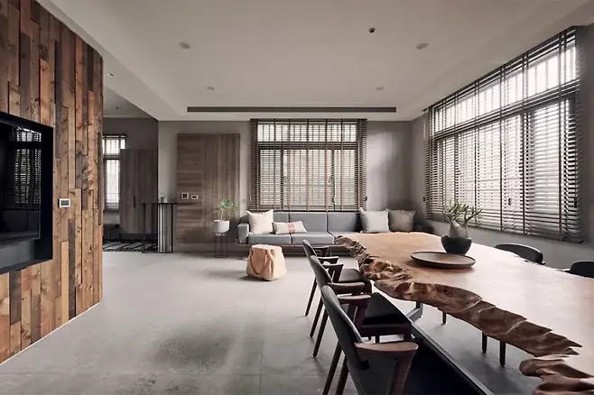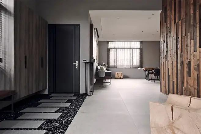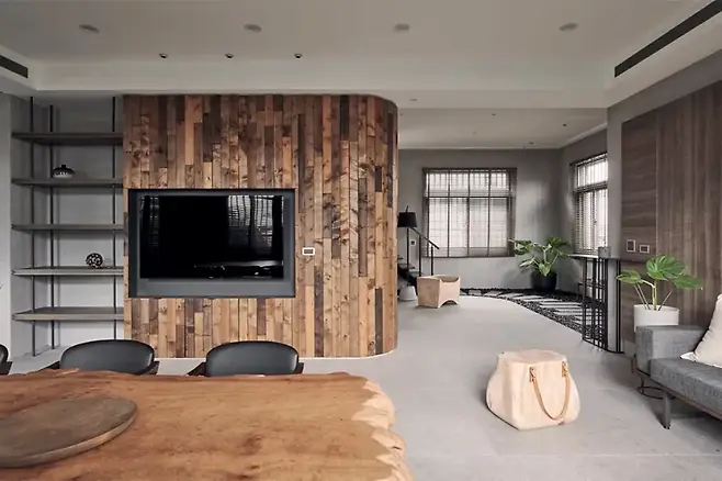 시멘트 타일과 전나무 판자의 조화는 견고하면서도 따뜻한 질감을 더하며, 나무결의 흐름은 공간의 유기적인 연결감을 더한다.