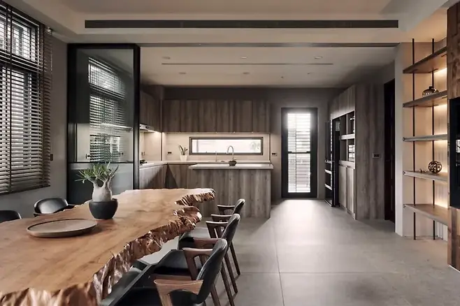 유리 슬라이딩 도어는 연기 차단 기능까지 갖추어 위생과 개방감을 동시에 만족시켰다. 오크 패널의 텍스처는 소재의 정직함을 드러내며, 전반적인 주방 분위기를 아늑하게 만든다.