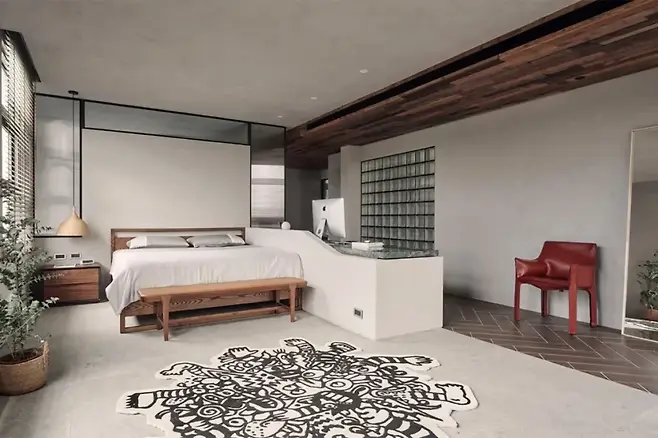 욕실과 침대 공간 사이의 칸막이는 모호하게 처리되어 시각적 개방감이 있다. TV 벽에는 월넛 소재를 사용해 안정적인 마무리를 지었다.
