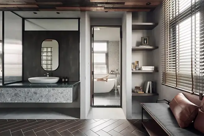 테라조, 시멘트, 월넛, 멜라민, 사문석까지 다양한 소재가 절묘하게 균형을 이룬 이 공간은 기능성과 미감을 동시에 충족한다. 독립형 욕조는 깊은 휴식을 위한 장치로, 외적 소음에서 벗어난 안정감 있는 분위기를 완성시키는 데 제격이다.