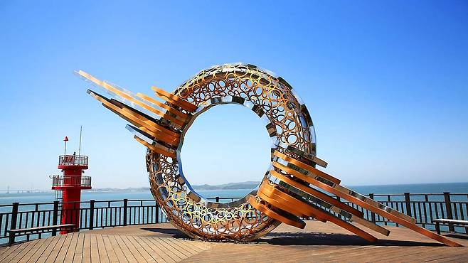 아치교를 건너면 기다리고 있는 곳이 바로 구봉도 낙조 전망대입니다. ‘석양을 가슴에 담다’라는 이름의 조형물은 원형과 사선 구조가 어우러져 해가 지는 순간, 정확히 그 틈에 붉은 태양이 걸리도록 설계되었습니다.