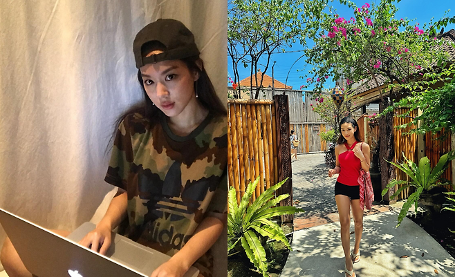 마지막 사진에서는 카무플라주 패턴의 오버사이즈 티셔츠와 블랙 캡으로 스트릿 패션을 선보이고 있다. 아디다스 로고가 프린트된 밀리터리 룩으로 캐주얼하면서도 트렌디한 분위기를 자아내고 있다. 노트북과 함께한 일상적인 모습에서도 세련된 패션 감각을 놓치지 않고 있다.
