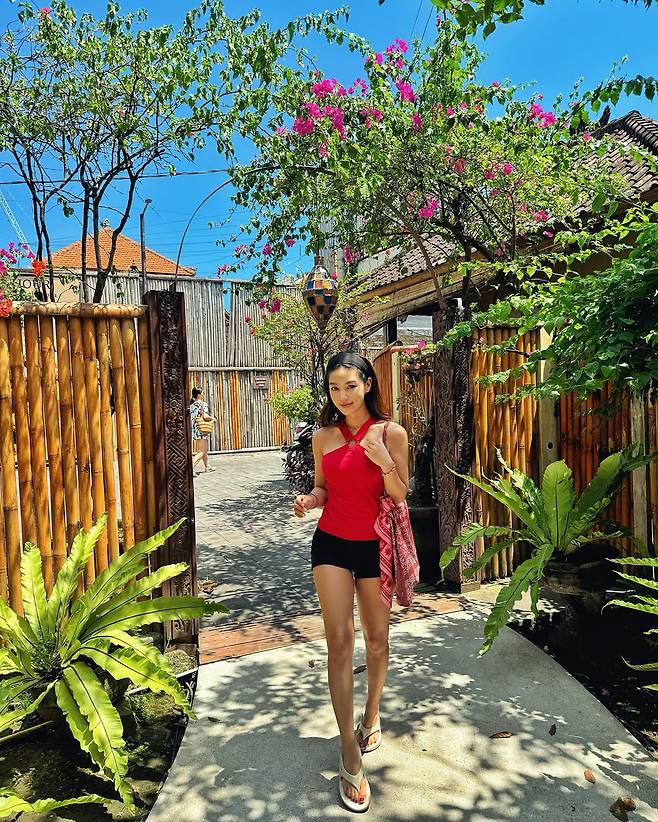 세 번째 사진에서는 레드 컬러 탱크톱과 블랙 쇼츠로 활동적인 여름 스타일을 연출하고 있다. 레드 스카프를 소품으로 활용하고 플립플롭을 신어 편안한 휴양지 패션을 완성했다. 울창한 열대 식물과 대나무 펜스가 어우러진 배경 속에서 자연스러운 매력을 발산하고 있다.