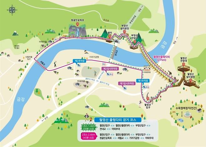 1코스(왕복 약 1.4km, 30분 소요)는 가볍게 걷기 좋은 코스로, 월영산 입구에서 출발해 출렁다리를 건너 부엉산 입구를 지나 천내교와 야외무대까지 이어집니다. 짧은 거리이지만 다리 위의 아찔함과 금강의 수변 풍경을 동시에 즐길 수 있습니다.