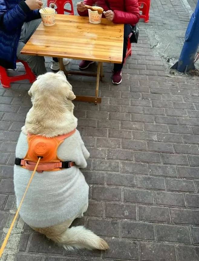 강아지는 노점상 옆 테이블에서 식사 중인 한 손님 앞에 자리를 잡았습니다. 그러고는 손님이 젓가락을 움직일 때마다 고개를 따라 움직이며 아주 진지한 표정으로 식사 장면을 관람하기 시작했습니다.