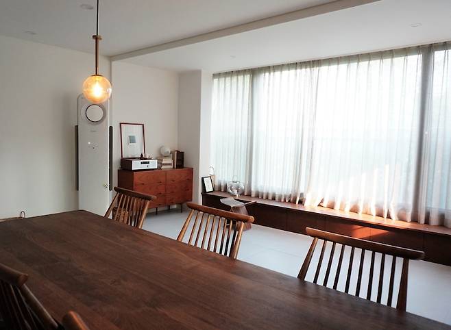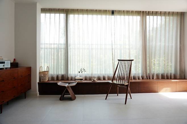설치한 지 2주가 채 안 되어 바닥판이 들떠 앉을 수 없던 거실 벤치도 창문의 톤과 컬러에 맞추어 다시 제작했어요.
