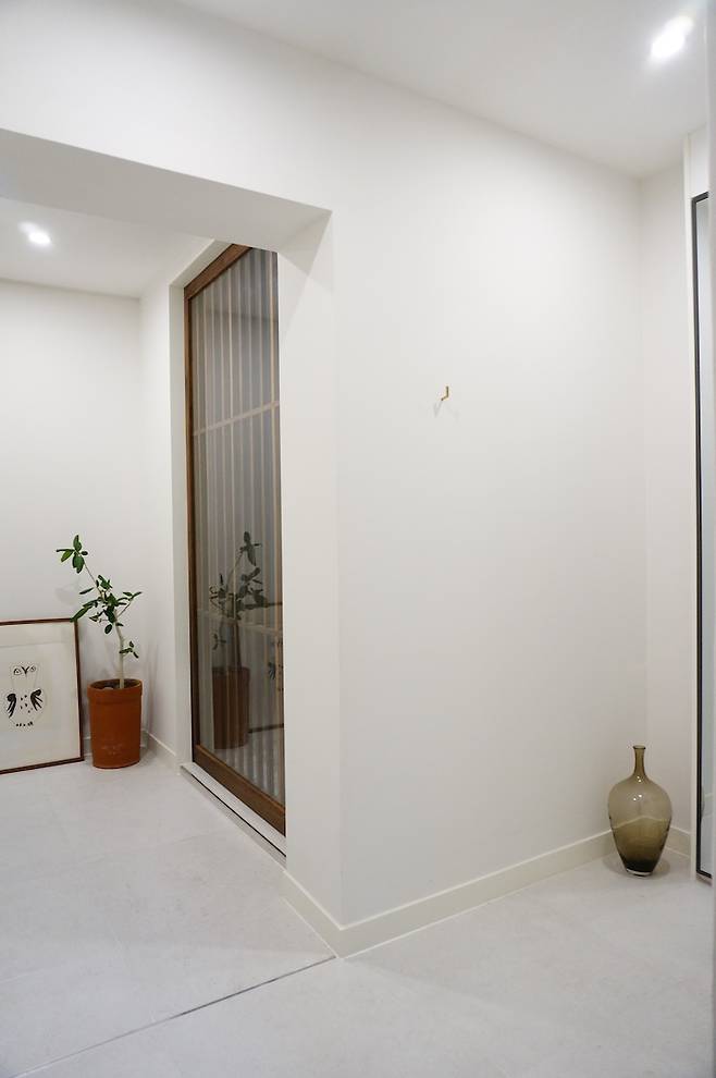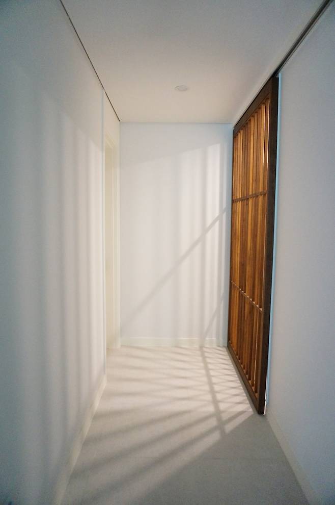 묵직한 느낌의 원목 중문으로 재시공하여 설치해 자칫 차가운 느낌일 수 있는 복도에 온기를 줄 수 있도록 했고요.