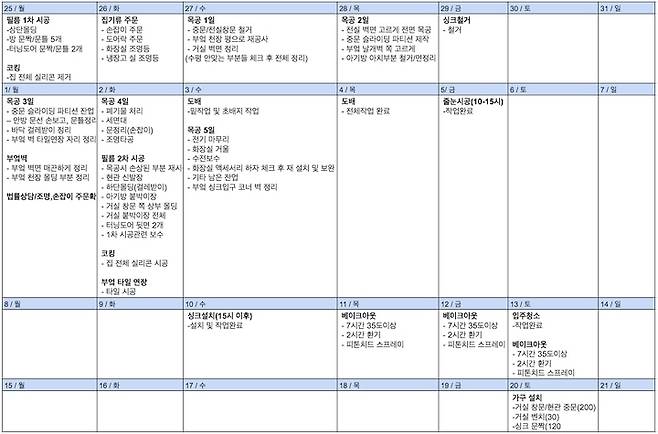 재시공 해야 하는 공사 목록을 적어 나열했고, 가능한 일정 내에서 각 시공 업체를 섭외해 스케줄 표를 만들었어요.