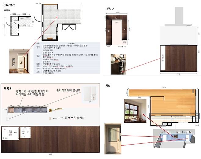 정리된 디자인 시안에는 가로/세로/깊이를 기재한 구체적인 사이즈와 컬러들을 함께 첨부해두는 등 최대한 상세하게 적어뒀어요. 그래야 시공할 때의 오차를 줄일 수 있으니까요. 재시공을 맡은 가구 업체에서 제가 전달한 자료 내용 그대로 다시 시공을 약속해주셨고, 실제 사용 시 불편사항이 없도록 굉장히 꼼꼼하게 재시공해 주셨어요.