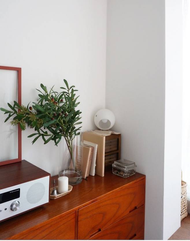 거실 한쪽의 날개벽은 구조상 허물 수 없어 살려둔 대신에 컴포넌트를 올려두어 오디오 테이블처럼 쓰고 있어요.