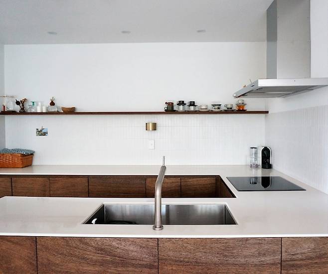 부엌을 재시공할 때 까다로웠던 부분은 각기 다른 재료들이 만나는 부분에서의 마감이었어요.