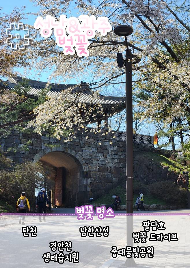 서울 근교 벚꽃 여행으로 광주는 탁월한 선택입니다. 광주의 대표적인 명소인 남한산성은 308번 국도를 따라 약 8km에 걸쳐 이어지는 벚꽃길이 장관을 이룹니다. 또한 성곽 등산 코스를 따라 이어지는 벚꽃도 예술이지요.