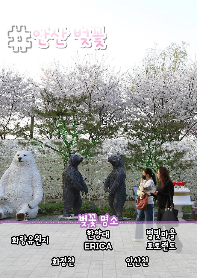 안산은 다양한 공원과 하천을 중심으로 벚꽃길이 형성되어 있어 서울 근교 나들이로 괜찮은 곳입니다. 안산 시민들의 대표적인 휴식처, 화랑유원지는 호수 주변 산책로를 벚꽃으로 가득 물들여 봄날의 정취가 물씬 느껴지는 곳입니다.