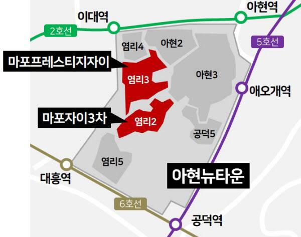 현재 아현뉴타운에 입주한 ‘자이’ 브랜드 아파트는 총 2곳이다. 염리2구역을 재개발해 2018년 입주한 ‘마포자이 더 센트리지(옛 마포자이3차·927)가구와, 염리3구역 ‘마포 프레스티지 자이’(2021년·1694가구)다. 두 아파트 모두 현재 국민평형인 84㎡(34평) 기준 실거래가가 20억원을 돌파할 정도로 집값이 올라있는 상태다.