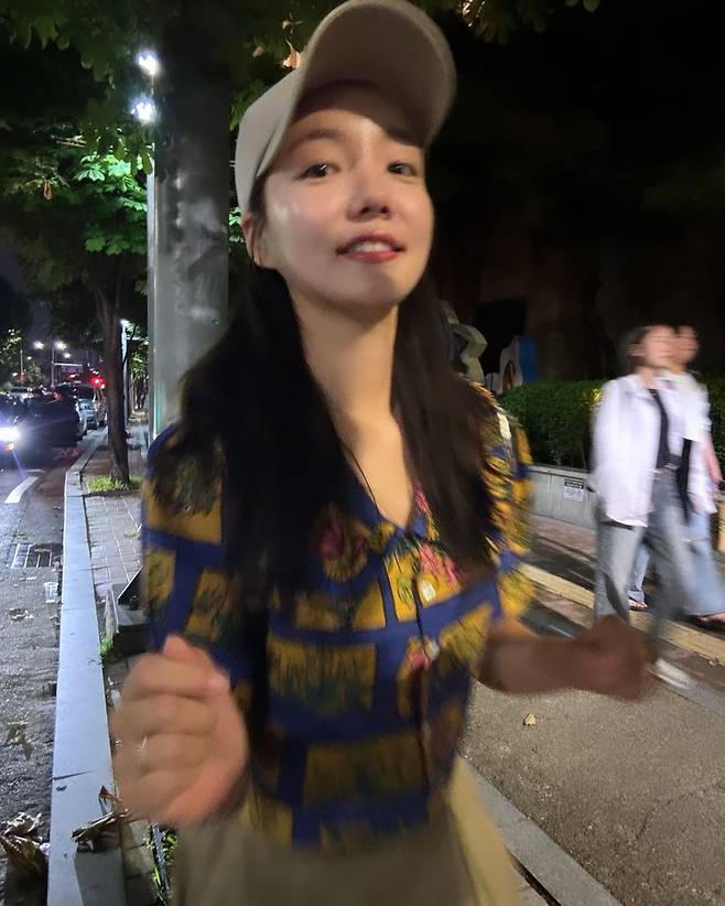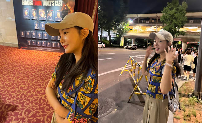 사진 속 문지인은 화려한 패턴이 있는 블라우스와 베이지톤의 슬랙스를 입고 캡모자를 써서 꾸안꾸룩을 선보이며 공연을 즐겼다.