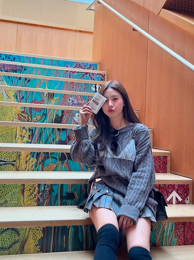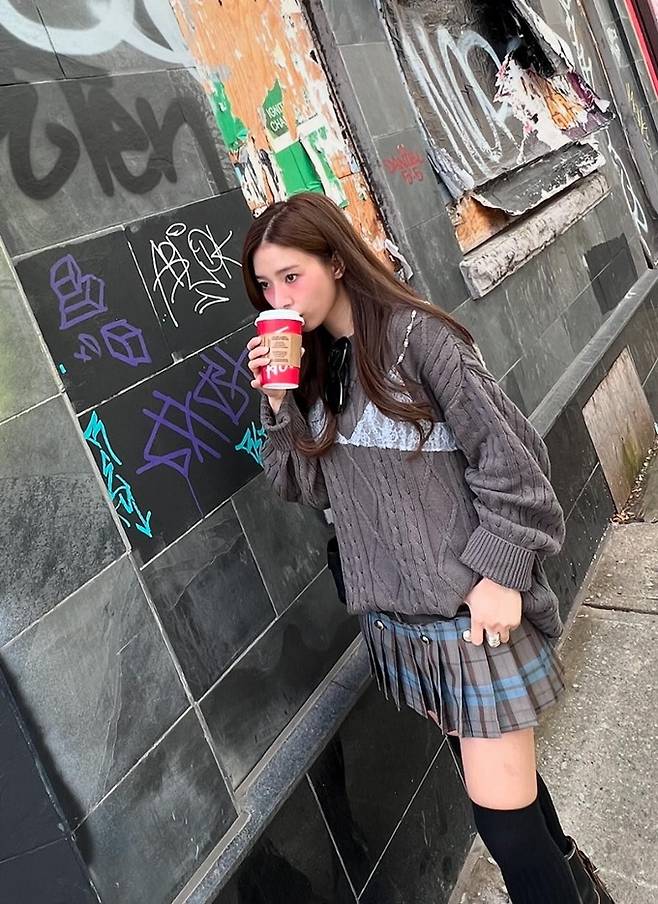 공개한 사진에서 김소은은 스웨터 위에 속옷을 입은 듯한 디자인의 니트웨어에 체크 플리츠 미니 스커트를 착용한 프레피룩으로 하이틴 소녀 같은 여행 스타일을 선보였다.