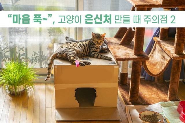 아울러 너무 높으면 고양이가 내려갈 수 없을 뿐 아니라, 먼지, 고양이 털이나 토사물 같은 각종 오염물을 제거하기 어려워 비위생적인 환경이 되기 쉽다는 점도 기억하자.