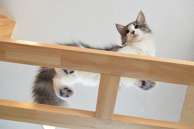 계단형이라면 고양이가 점핑하지 않아도 오를 수 있도록 20cm 간격으로 단다. 이 높이는 아기 고양이와 노령묘도 안전하게 오르내릴 수 있다.