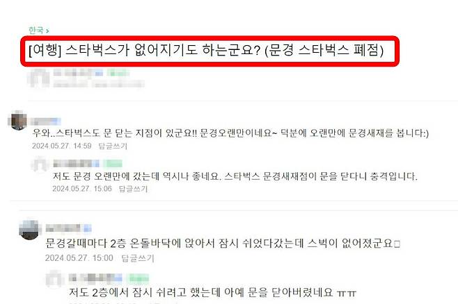 이에 대해 한 온라인 커뮤니티에는 “스타벅스가 없어지기도 하는 군요? (문경 스타벅스 폐점)”이라는 제목의 글이 올라오기도 했다. 글쓴이는 “저만의 힐링여행지인 문경에 다녀왔는데요. 문경 스타벅스가 없어진 사실을 알았다”라는 취지의 내용을 남겼다.