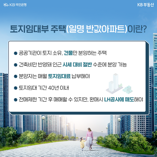 일반적으로 분양가 중 상당부분을 차지하는 땅값을 뺀 건물만 분양하는 토지임대부 주택은 주변 시세의 절반 이하 수준으로 저렴해 질 수 있어 '반값아파트'라고 불리는 것입니다.