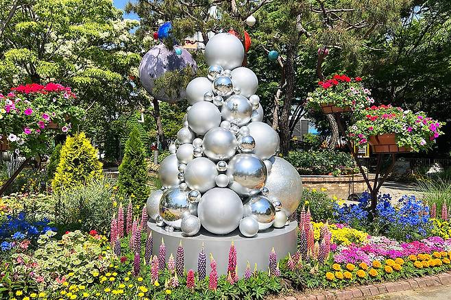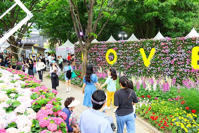 유성 봄꽃 전시회는 단순한 꽃 전시가 아니다. 행사장에 들어서면 먼저 시선을 사로잡는 것은 거대한 꽃폭포와 사각꽃탑 같은 대형 꽃 조형물이다. 이 조형물들은 꽃으로 만들어진 정원의 일부로, 포토존으로도 활용되어 인생샷을 남기기에 제격이다.