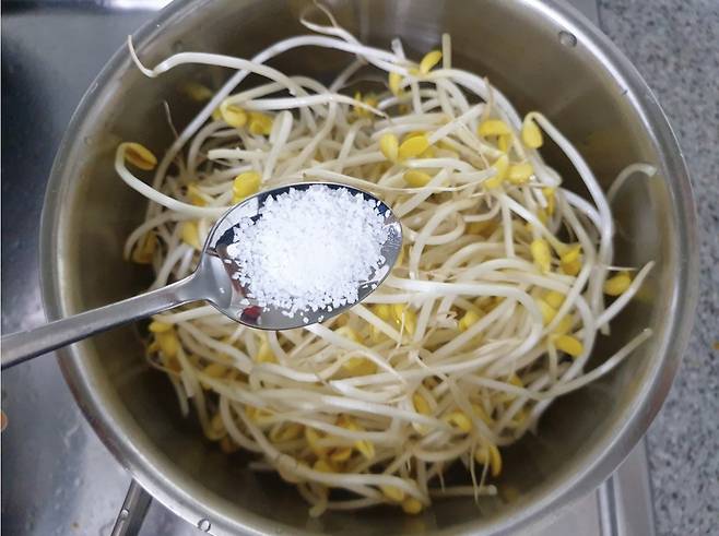 콩나물을 데치는 과정에서 많은 분들이 소금을 한 스푼 넣고 있어요. 뭔가 깨끗해지는 느낌도 받으면서 냄새가 제거될 거 같고, 더 아삭아삭해질 거 같아서 인데요.