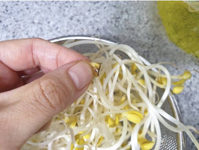 콩나물을 체망에 넣고 찬물로 여러 번 헹궈주세요 이때 콩나물 껍질이나 꼬리가 너무 긴 것, 물러진 것이 있다면 제거해 주세요