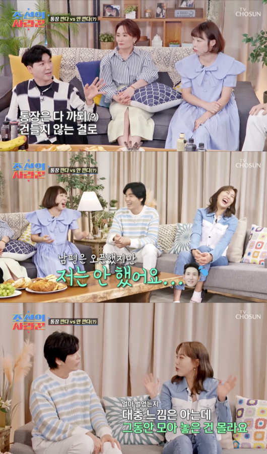 이어 스튜디오에 있는 패널들은 각자 통장을 오픈했는지 여부를 언급했다. 먼저 최성국은 아직 서로 통장을 공유하지 않았다고. 박수홍은 “우리는 다 오픈했다. 다 오픈하되 건들지는 않는 걸로. 목표를 세우고 같이 하기로 했다”고 밝혔다.