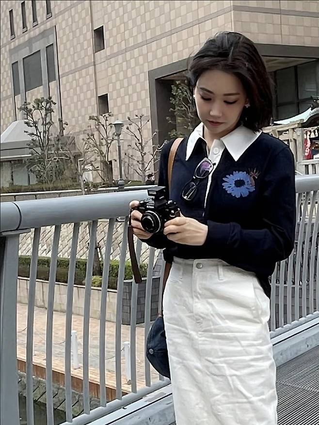 또 은은한 핑크 트위드 재킷을 더한 스타일링은 클래식한 여성미를 더하면서도 과하지 않은 화사함으로 시선을 끌었고, 카메라와 크로스백 같은 소품은 룩에 여행지 감성과 여유로운 무드를 자연스럽게 얹었습니다.
