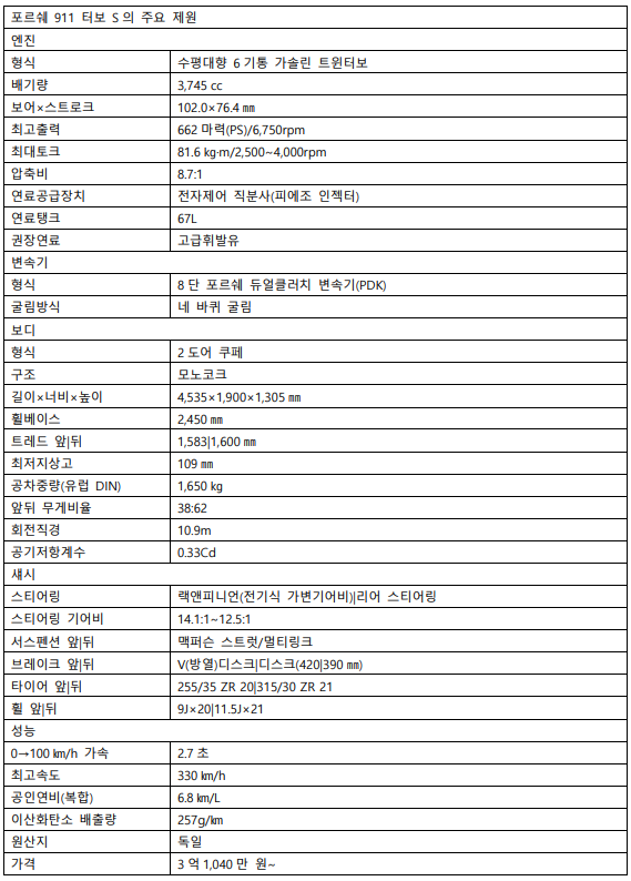 변속기는 8단 포르쉐 듀얼(더블) 클러치(PDK)로, 0.001초 만에 변속한다. 포르쉐 911 터보 S는 0→시속 200㎞ 가속을 8.9초에 마치고, 시속 330㎞까지 가속을 이어간다. 유럽 기준 공차 중량(DIN)은 1,650㎏. 이전보다 덩치를 살짝 키우되 인산철리튬(LiFePO4) 배터리와 경량 소음방지 유리, 경량 앞뒤 스포일러 등으로 무게 증가를 최소화한 덕분이다.
