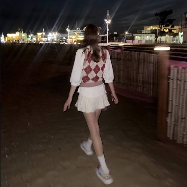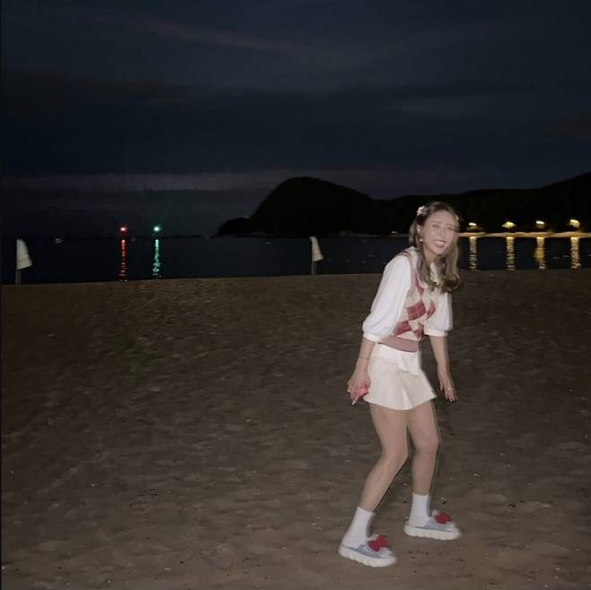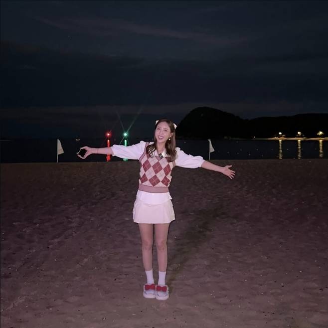 머리에 핀을 꽂아 청초한 매력을 살린 모습은 밤하늘과 반짝이는 조명 속에서 더욱 빛났으며, 자유롭게 걷고 팔을 벌린 포즈는 여름밤의 해변을 즐기는 러블리한 순간을 그대로 담았습니다.