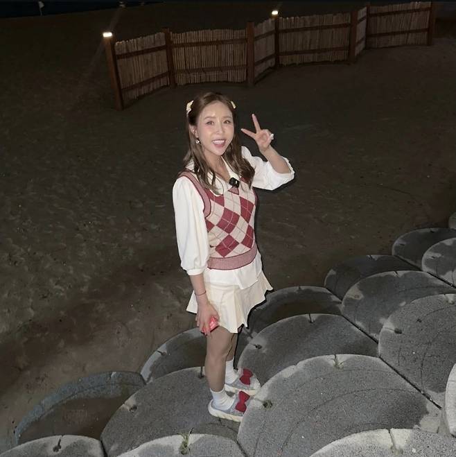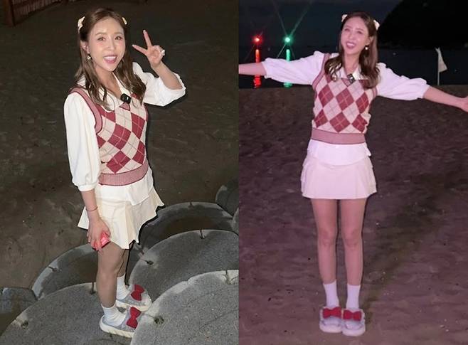 코요태 신지가 밤바다를 배경으로 소녀 감성이 물씬 풍기는 프레피룩을 선보였습니다.