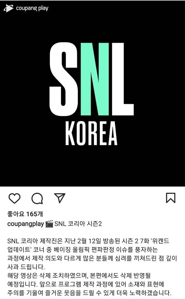 | ▲ '쿠팡플레이' 공식 인스타그램 계정에 게시된 사과문. '수어 비하'에 대한 내용은 빠져 있다. |