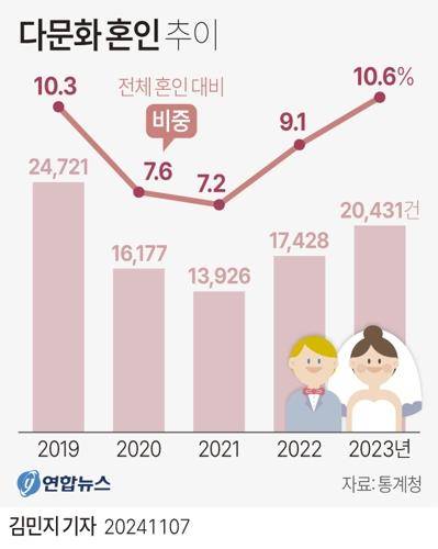 (서울=연합뉴스) 최재석 기자 = 지난해 우리나라에서 결혼한 10쌍 중 한 쌍이 신부나 신랑이 외국인인 다문화 혼인이었다고 한다. 코로나 때 위축됐던 국제결혼이 다시 활발해지면서다. 통계청이 발표한 '2023년 다문화 인구동태 통계'에 따르면 전체 혼인 중 다문화 혼인 비중이 10.6%로 13년 만에 가장 높았다. 유형별로 보면 아내가 외국인 경우가 10건 중 7건(69.8%)이었다. 남편이 외국인 경우는 10건 중 2건(17.9%) 정도였다. 나머지(12.3%)는 부부 모두 또는 어느 한쪽이 귀화자인 경우다. 외국인끼리 한국에서 결혼한 사례는 다문화 혼인으로 분류하지 않는다.