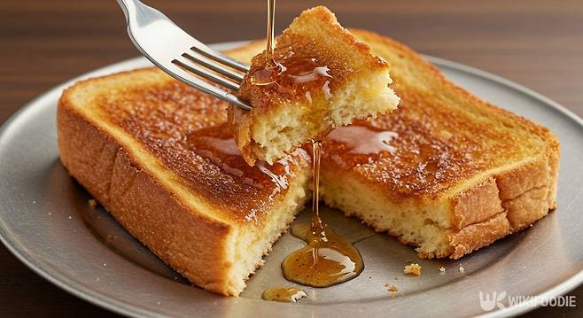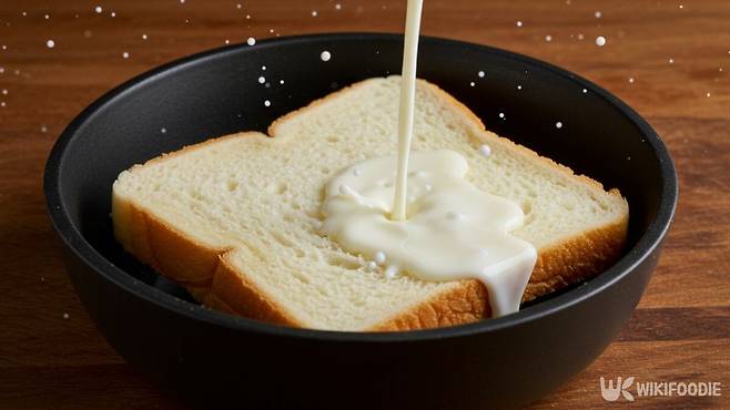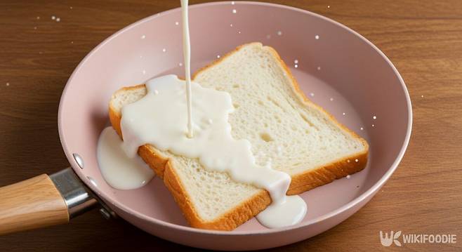 레시피의 시작은 식빵에 우유를 붓는 일이다. 130ml의 우유를 골고루 부어 빵이 충분히 흡수할 수 있도록 한다. 한쪽 면만 적시지 말고, 중간에 한 번 뒤집어 양면 모두 스며들게 해야 한다. 식빵이 스펀지처럼 우유를 머금을 때까지 잠시 기다린다.
