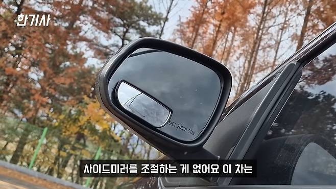또 다른 단점으로는 이 차는 사이드미러를 조절하는 게 없어서 손으로 조절을 해야 돼요. 여기 꼬다리 하나 넣어놓고 손으로 조절해야 하는데, 제가 지금까지 아무리 차를 많이 타봤어도 이 사이드미러를 전동이 아닌 수동으로 조절하는 차를 타 본 적이 없거든요. 이 차는 손으로 조절해야 되기 때문에 옆에 탄 분이 만지면 골치가 아파집니다.