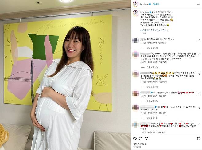 정주리는 17일 오후 자신의 인스타그램에 "다섯 번째 아가야 안녕"이라며 임신한 자신의 모습을 올렸습니다.