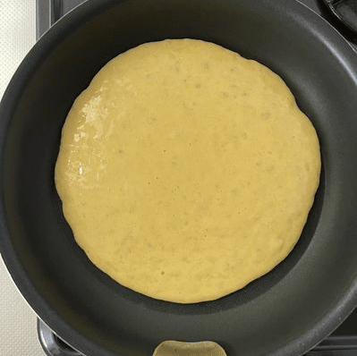 두꺼운 팬케이크보다는 조금 얇게 펴서 굽는 게 익히기도 쉽고 먹기에도 부담이 없다. 겉은 노릇노릇하고 속은 촉촉하게 완성된다.