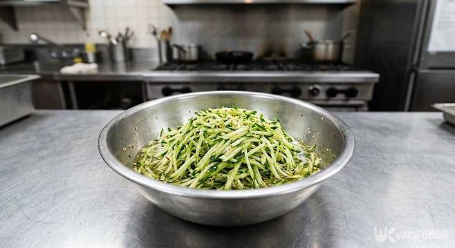 오이절임을 사용할 때는 오이를 채 썰어 소금과 식초를 넣어 잠시 두면 된다. 물이 조금 나오면 가볍게 짜서 준비한다.