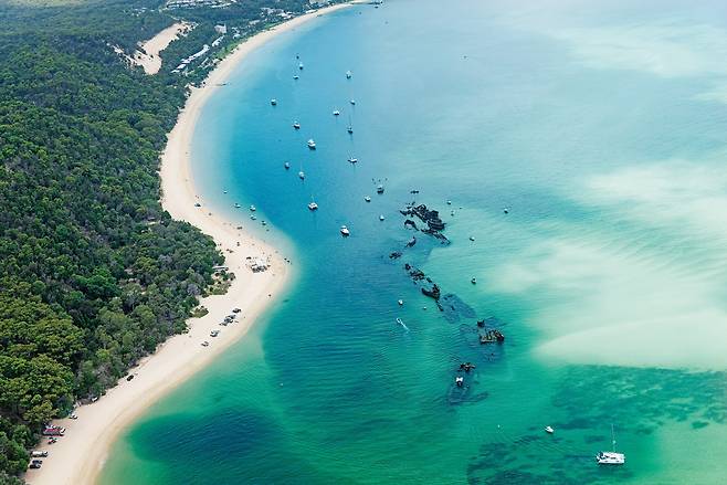 에스프레소용 커피 가루 같은 모래가 발가락 틈으로 파고든다. 호주에서 세 번째로 큰 모래섬, 모튼 아일랜드가 품은 사막에 왔다. 등산용 마스크와 선글라스로 무장하고 언덕 앞에 비장하게 섰다. 이틀 전, 골드코스트에서 서핑 강습을 받고도 파도를 못 타 분했던 마음을 샌드보딩으로 설욕하고 싶었다. 광대한 모래 언덕과 짙푸른 하늘 사이, 나무 몇 그루가 파슬리 가루처럼 뿌려진 비현실적인 풍광은 눈부시지만 옆구리에 판자를 끼고 언덕 오르기는 녹록지 않다. 없는 고소공포증도 생길 것 같은 아찔한 높이, 네발로 기지 않으면 굴러떨어지는 가파른 경사와 작렬하는 햇빛 탓에 온몸이 땀으로 흠뻑 젖었다. 드디어 차례가 왔다. 자세를 제대로 잡지 않으면 뒤집혀 밀가루 범벅한 동태전 꼴이 되는 것을 봤기 때문에 꽤 긴장됐다. 겁먹은 것이 무색하게 보딩은 12초 만에 끝났다. 속도가 시속 40km/h 정도에 달하기 때문이다. 스피드와 스릴을 좀 더 체감하고 싶다면 고강도 운동에 버금가는 ‘듄(Dune)’ 클라이밍의 고통을 이겨낼 것. 세 번쯤 타면 아쉬움도 직성도 풀린다. 다음 순서를 위해 지체 없이 길을 나선다. 이미 눈치챘겠지만 모튼 아일랜드는 액티비티의 천국이다.