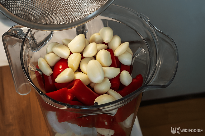 6. 믹서기에 사과, 양파, 홍고추, 마늘, 생강청, 새우젓, 멸치액젓, 찬밥, 매실액, 생수를 넣고 간다.