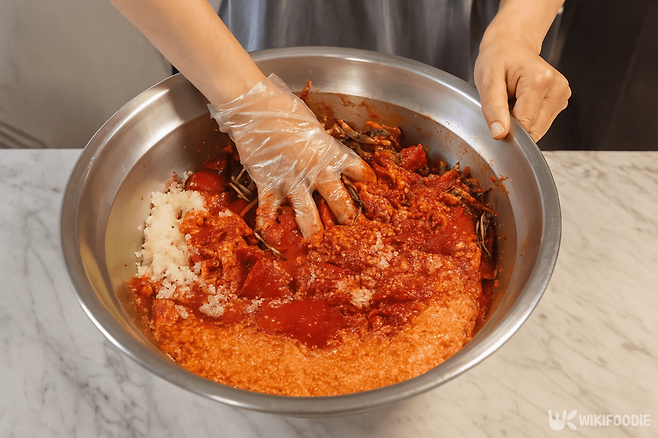 양념장은 김치 맛의 중심이다. 믹서기에 사과 1개, 양파 1개, 홍고추 8~10개, 통마늘 30개, 생강청 2스푼, 새우젓 3스푼, 멸치액젓 1컵, 찬밥 반 공기, 매실액 반 컵, 생수 반 컵을 넣고 곱게 간다. 사과와 양파는 단맛을 더하고, 찬밥은 양념의 점성을 높여준다. 여기에 미리 버무려둔 무·쪽파와 고춧가루 1컵을 추가해 섞으면 깊고 진한 김치 양념이 완성된다.